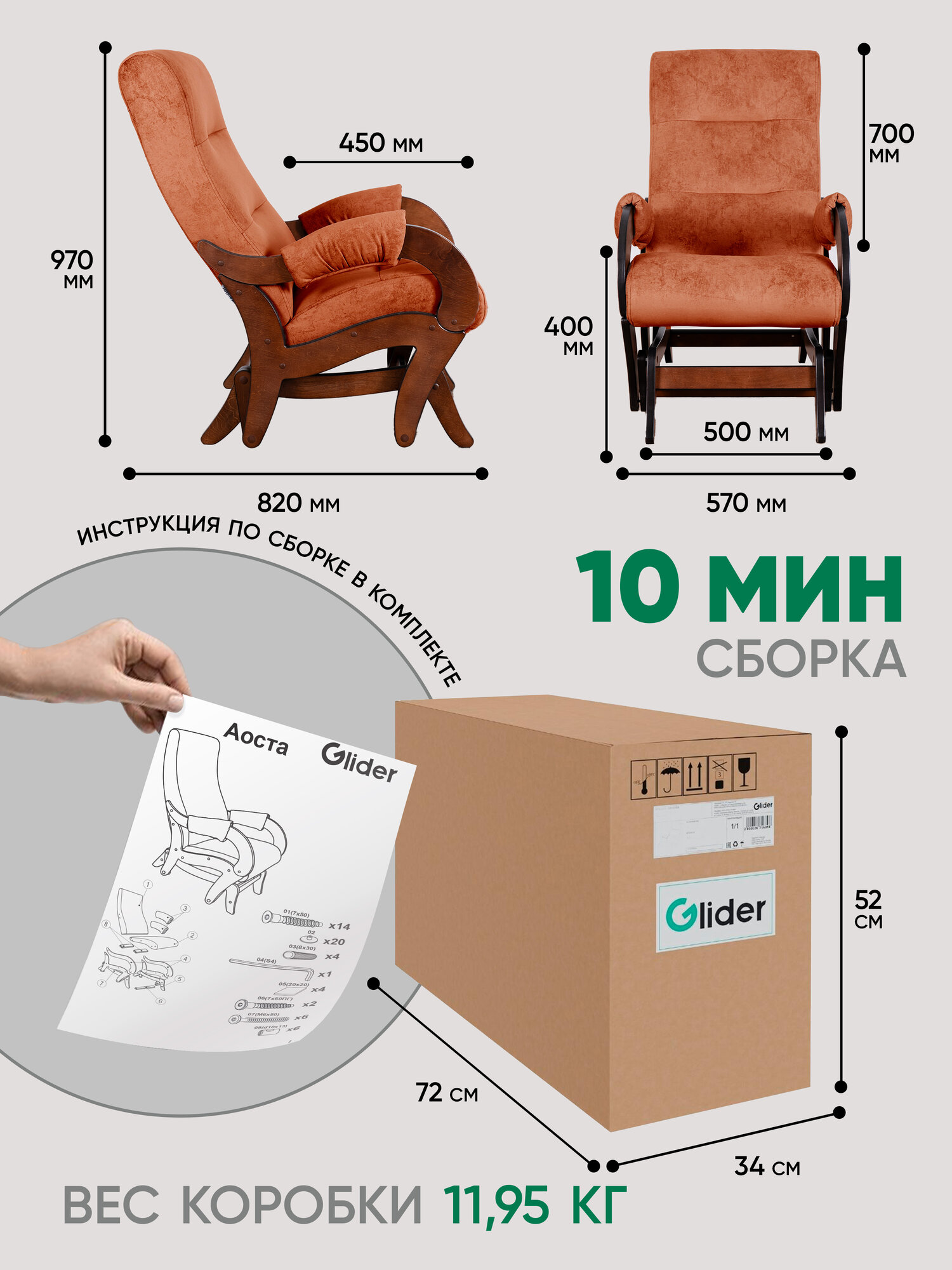 Отзывы на Кресло-качалка с маятниковым механизмом Glider Аоста в ткани Микровелюр, цвет оранжевый / коричневый орех