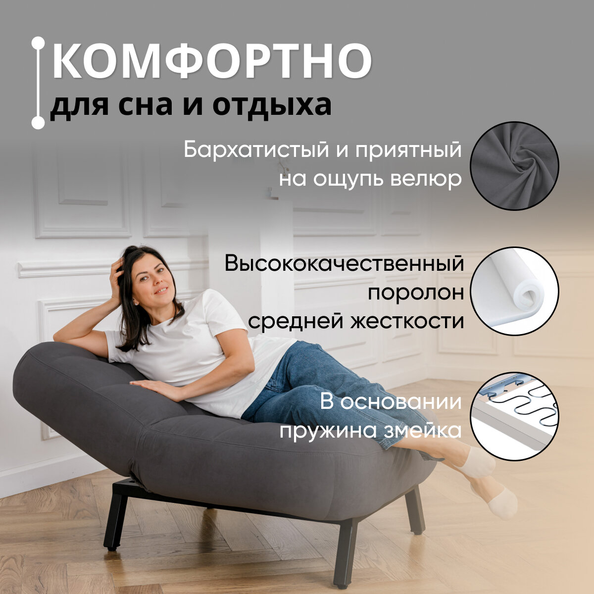 10 цен на Кресло Brendoss 306 раскладное с регулируемой спинкой лофт, механизм клик-кляк, материал износостойкий велюр, цвет графит