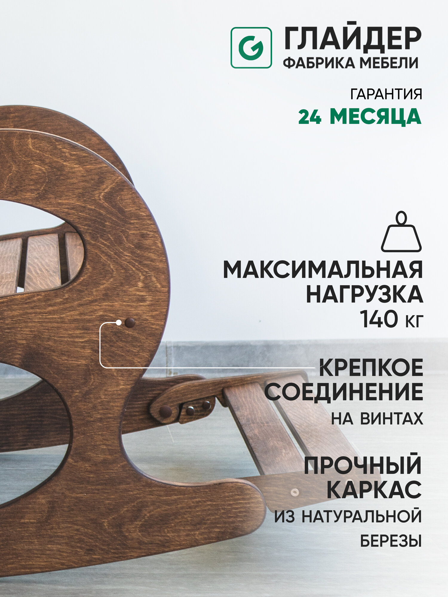 | Дополнительная информация | Кресло-качалка от российской компании-производителя Glider станет любимой вещью в Вашем доме. Благодаря продуманному дизайну и компактности кресло для отдыха отлично вписывается в любой интерьер, будь то дом или офис. Анатомическая спинка прекрасно расслабляет спину и шею. Кресло имеет безопасный угол качания - это исключает возможность опрокидывания. Изделие выполнено из качественных материалов. Каркас кресла сделан из натуральной березы. Все материалы гипоаллергенны и безопасны как для взрослых, так и для детей. |
