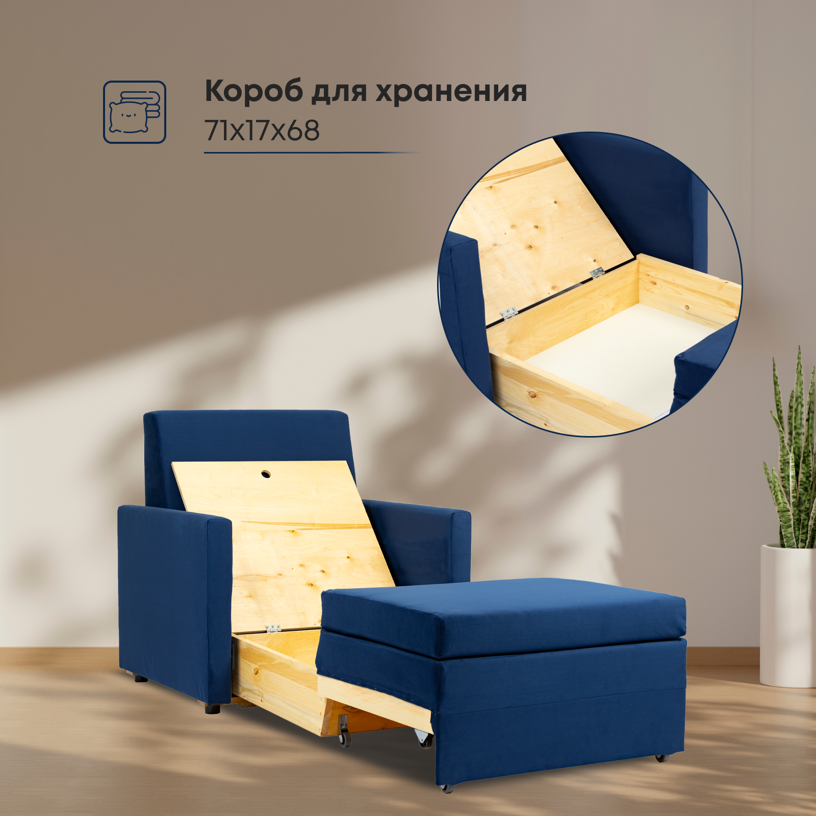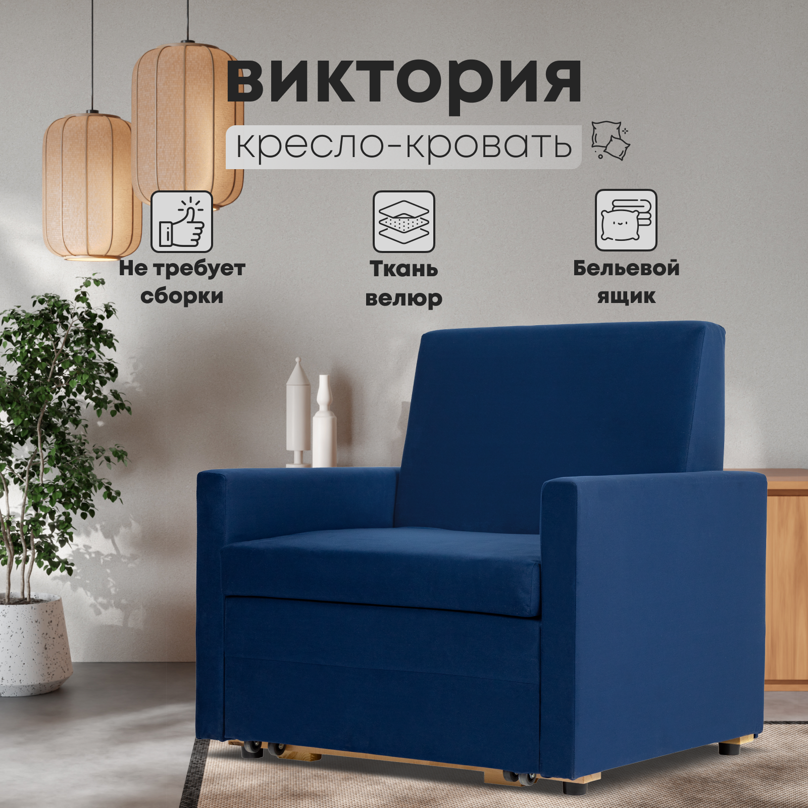 Кресло-кровать Виктория, раскладное, выкатной механизм, велюр, Синий, в гостиную, в спальню, спальное место, кровать, Divan24 информация: