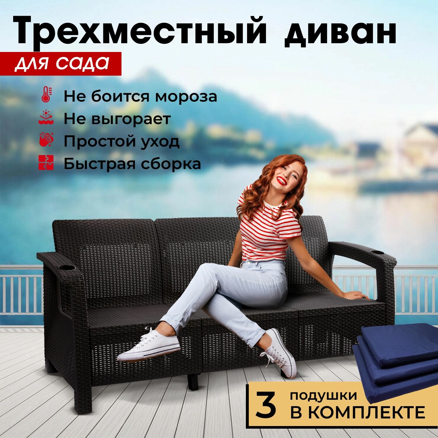 Диван садовый трехместный YALTA (Ялта Ротанг-плюс) + 3 коричневые подушки (искусственный ротанг (пластик)