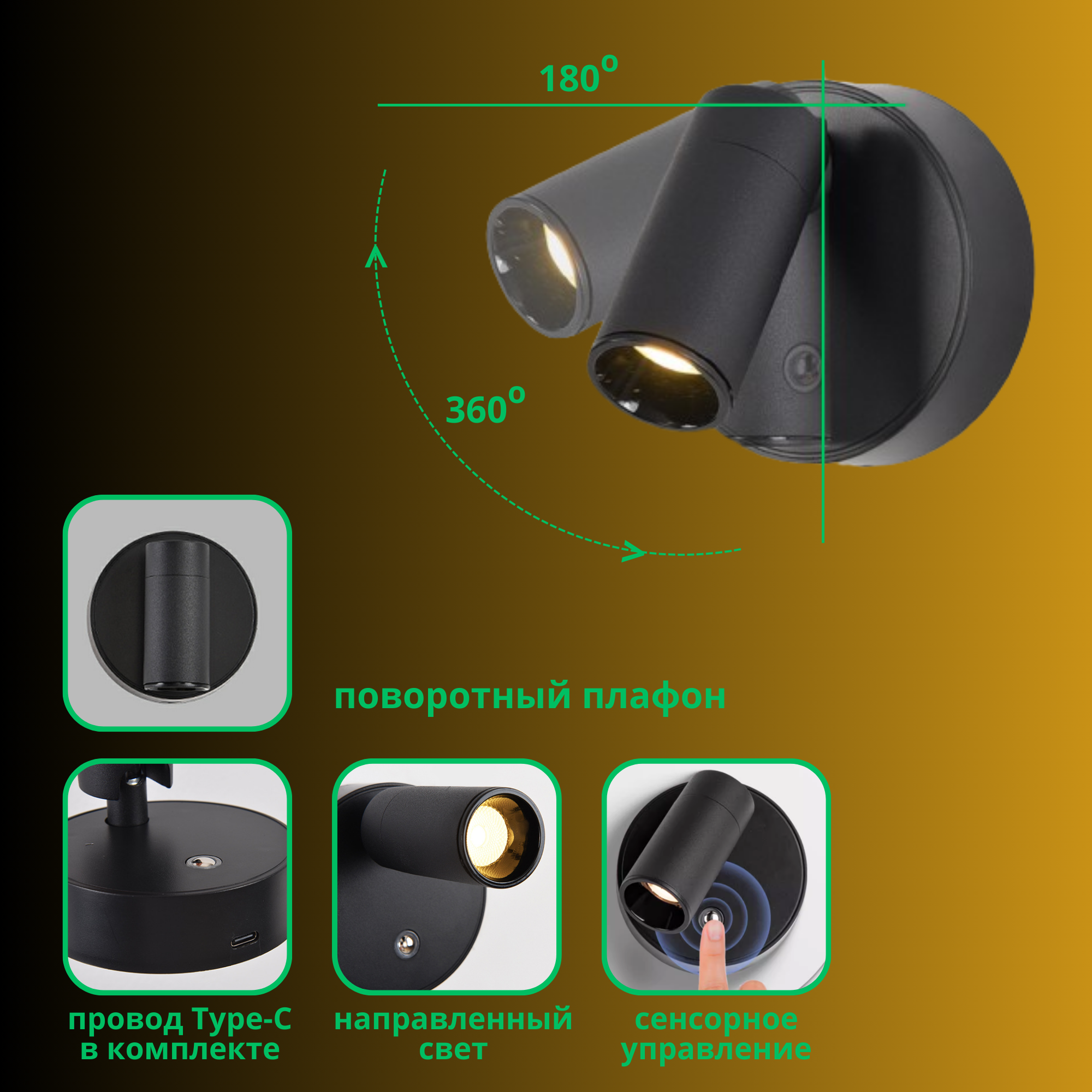 | Особенности | крепление в комплекте / лампы в комплекте / питание от USB / поворотный / режим ночника / с выключателем / с лампой для чтения / с подсветкой |