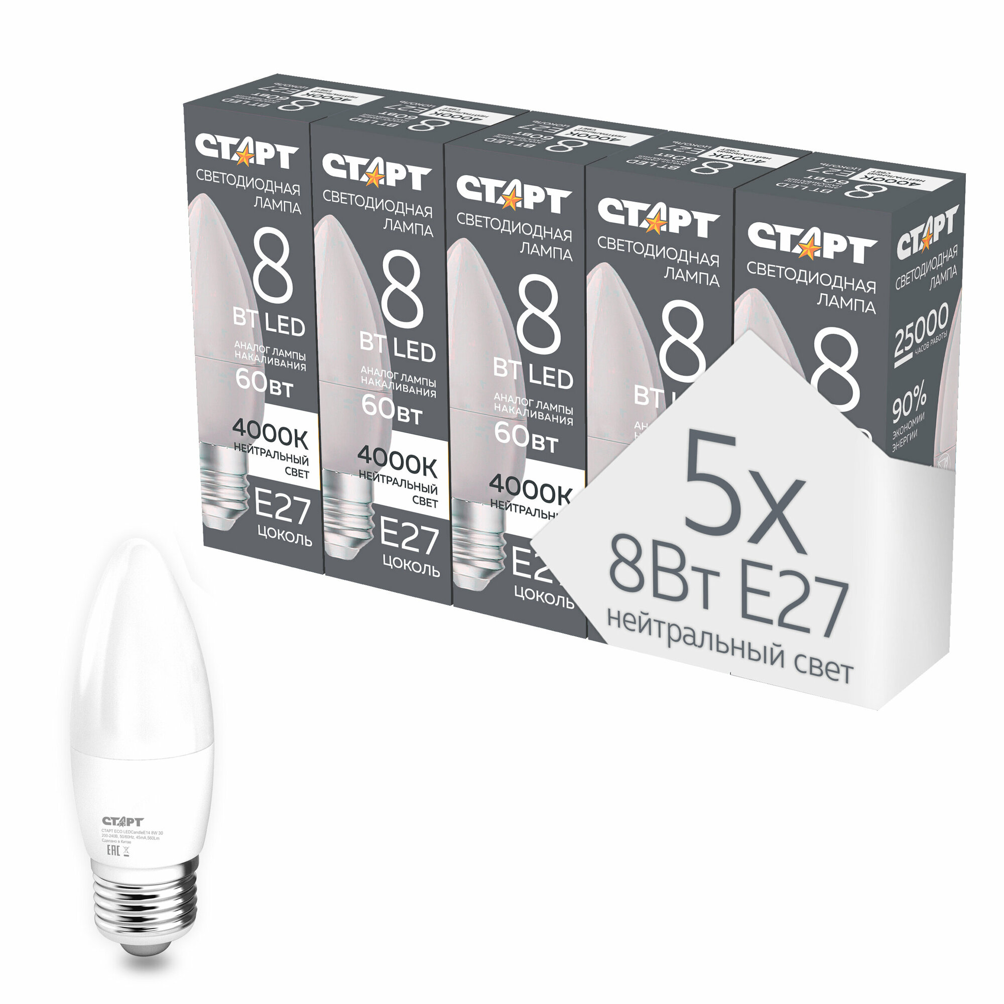 10 цен на Набор ламп старт LEDCandleE27 8W 4000K, 5 шт.