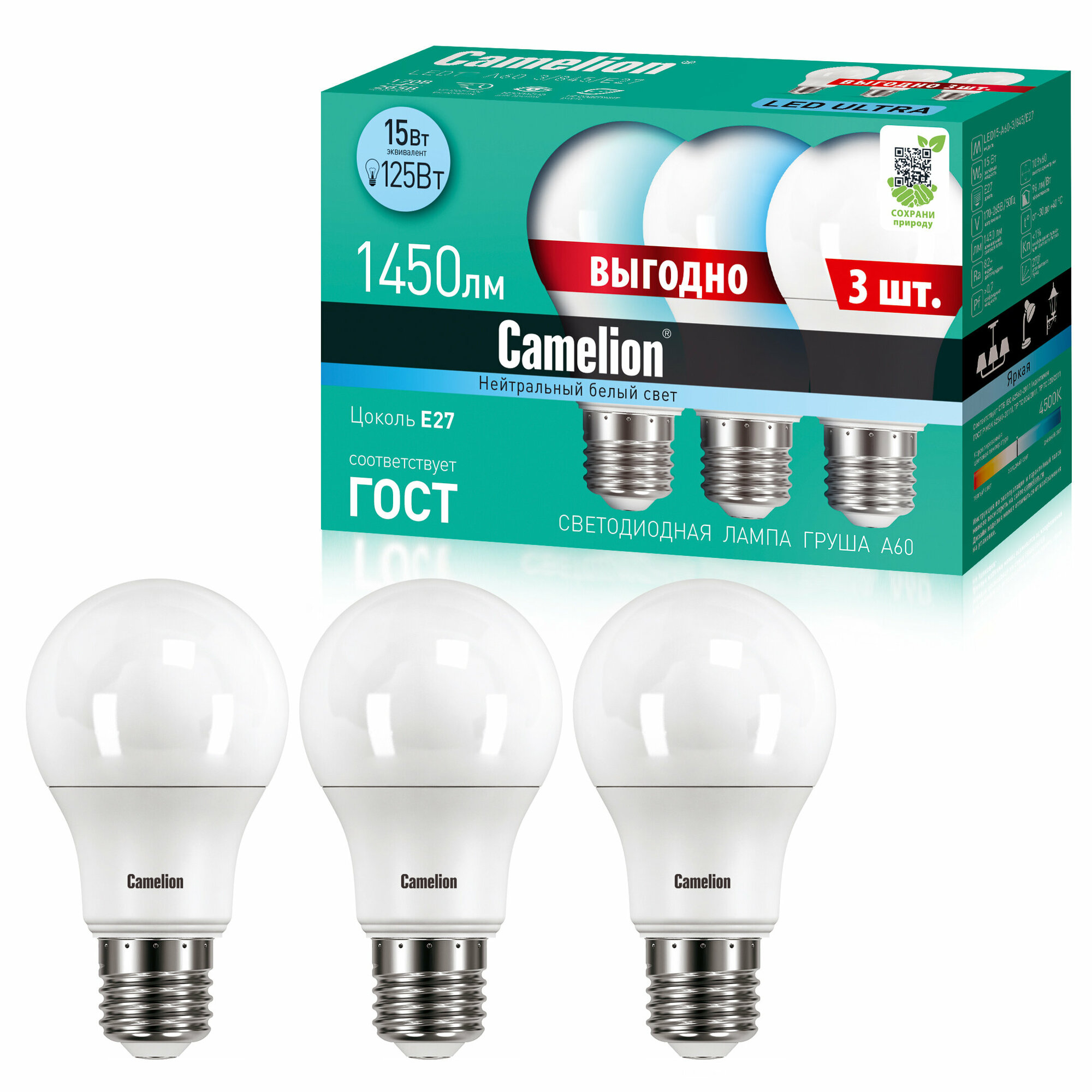 Светодиодные лампочки Camelion LED 15 Вт, 220 В, 3 штуки в упаковке информация: