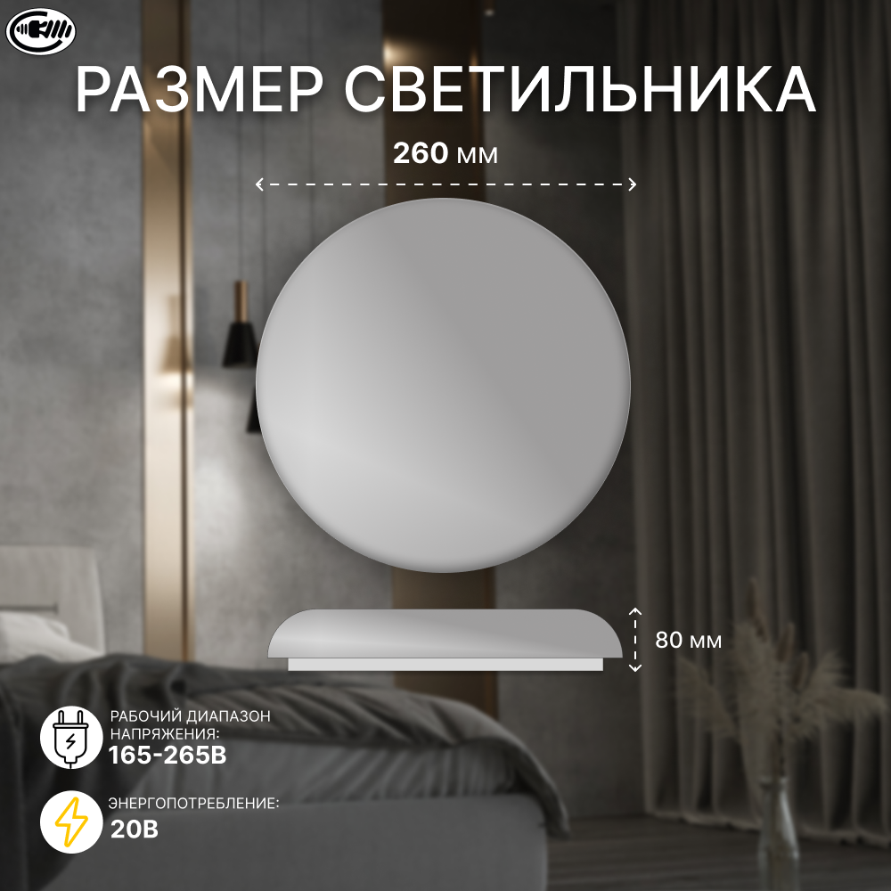 Светильник потолочный светодиодный накладной на кухню/ в спальню/ в детскую, 20Вт, люстра потолочная бриллиант, холодный свет, LEEK. Свет-к с/д (потолочный) СЛЛ 041 20Вт 6К Бриллиант (260х80) (10) информация: