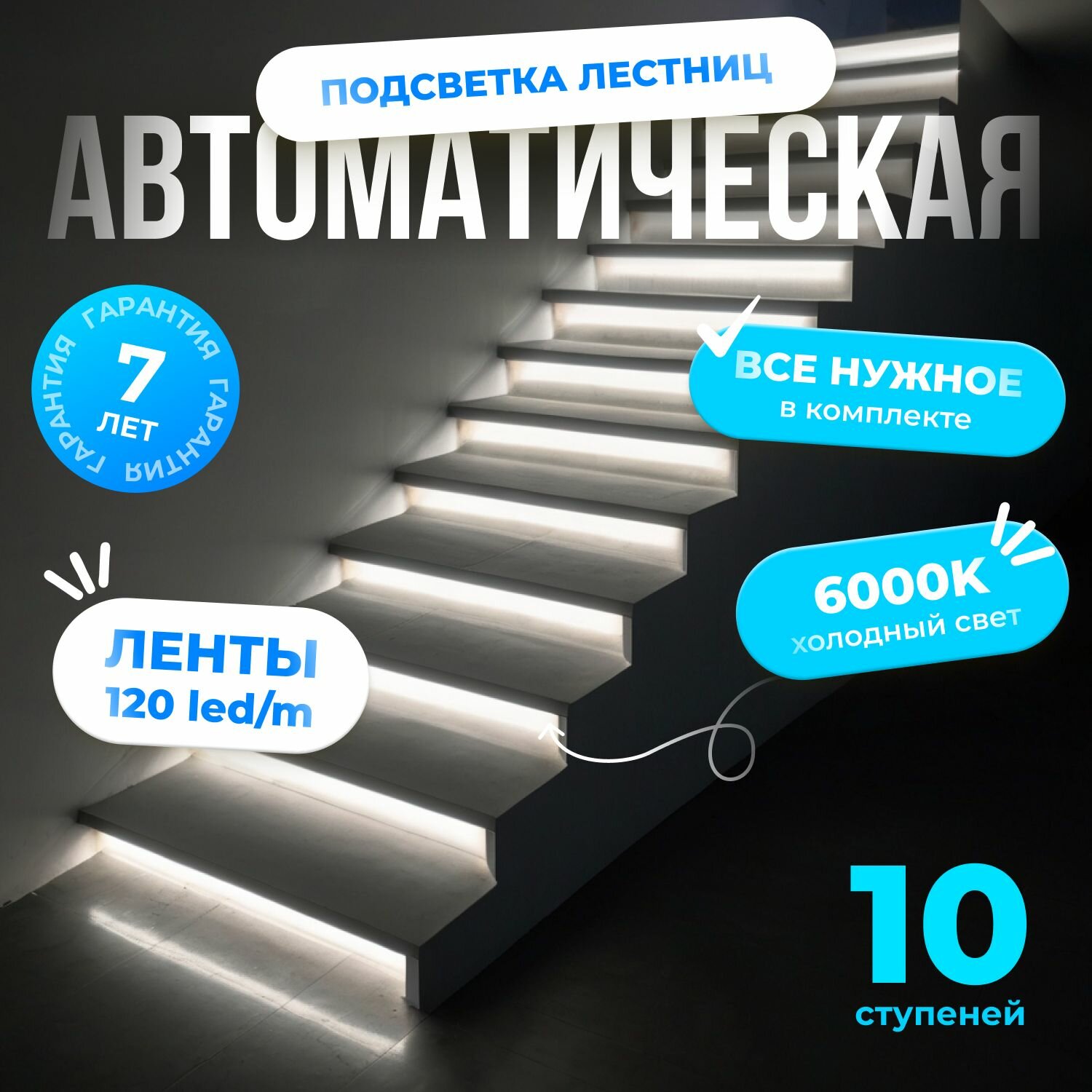 Автоматическая подсветка лестницы с датчиками движения холодный свет 6000К 10 ступеней Soft Lights информация: