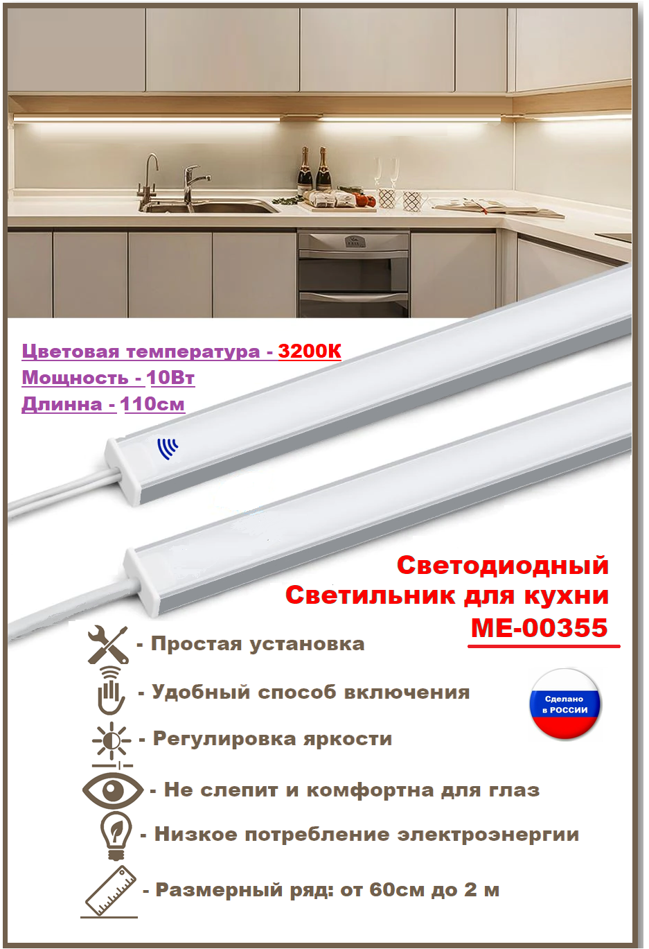 Светодиодный светильник для кухни под навесные шкафы, с включателем от взмаха руки, 110см, 3200К-тёплый. информация: