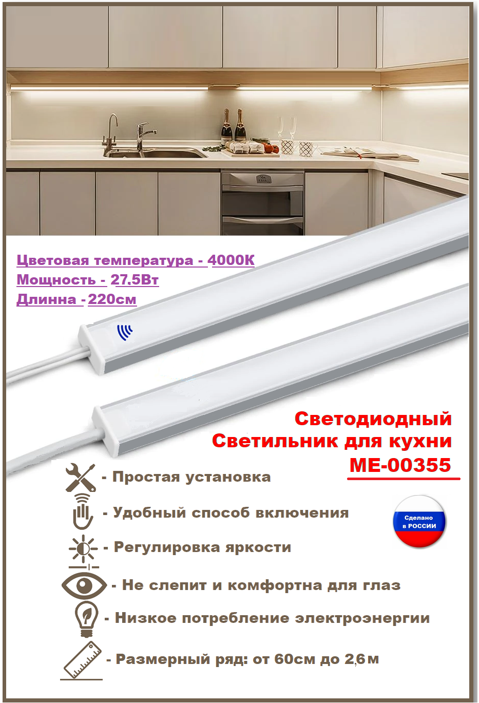 Светодиодный светильник для кухни под навесные шкафы, с включателем от взмаха руки 220см (из 2х частей 110см+110см), 4000К-дневной белый. информация: