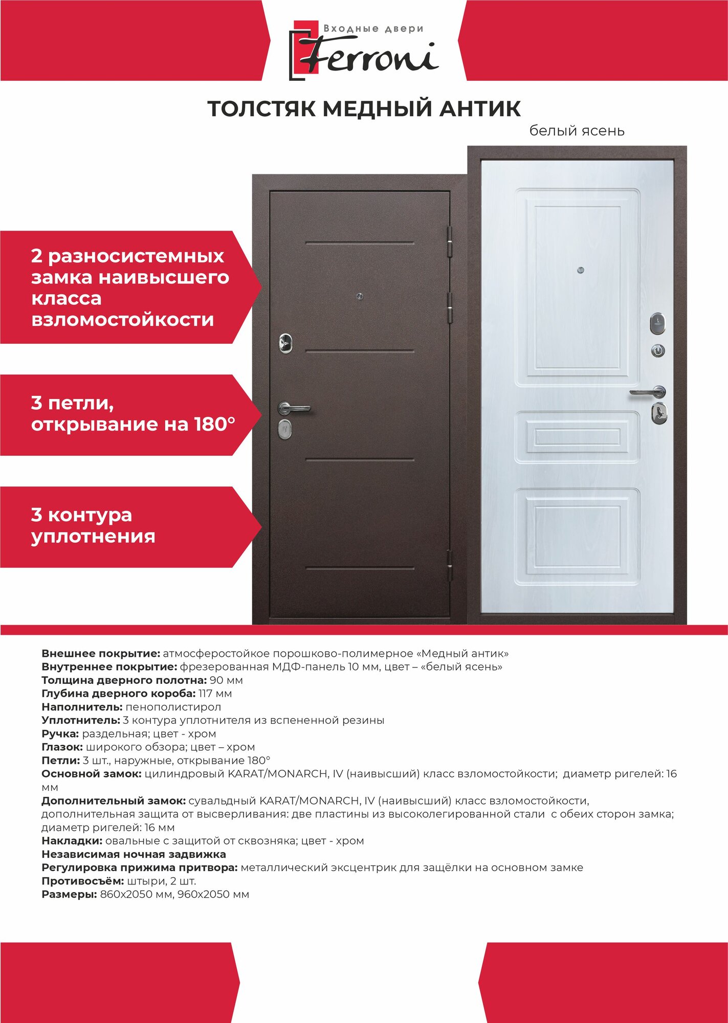 Входная дверь Ferroni Толстяк Медный Антик Белый Ясень (860мм) правая информация: