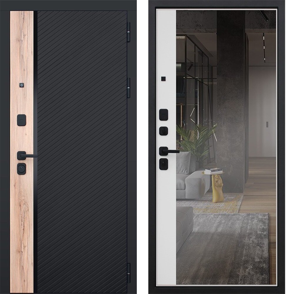 Входная металлическая дверь с зеркалом "Фрегат" дуб галиаф, шагрень черная, черный молдинг / Белый матовый 40 100 ₽