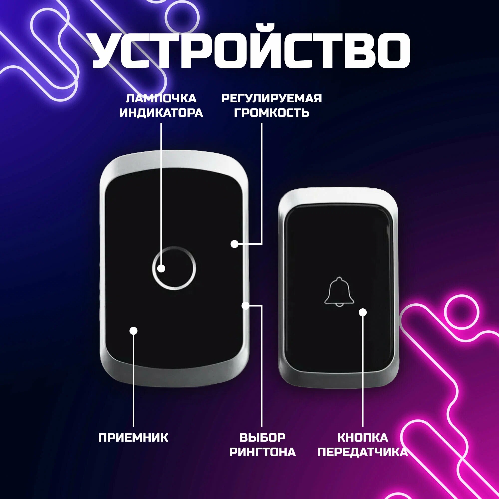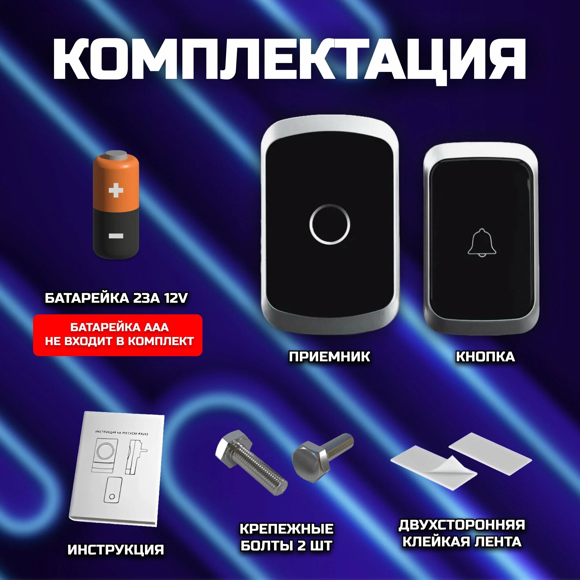 Звонок дверной беспроводной электрический уличный от сети для дома и дачи влагозащищенный на дверь, 110 Дб, IP44, дальность до 150м, 60 мелодий, батарея в комплекте информация: