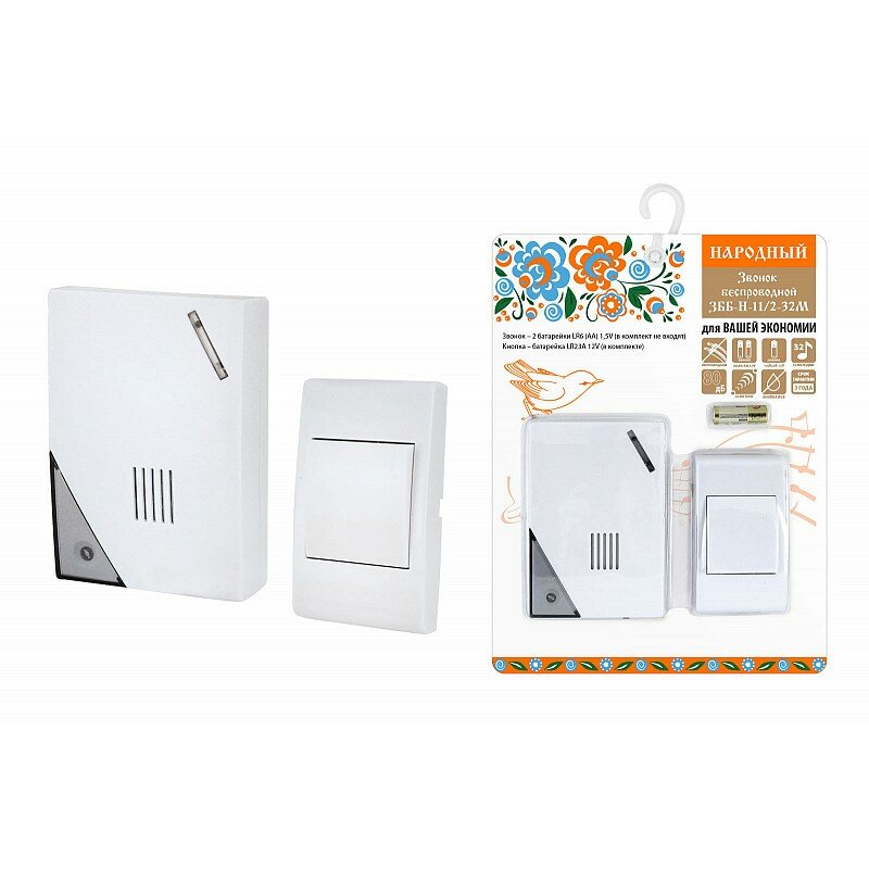 Отзывы на Звонок беспроводной на батарейках народный ЗББ-Н-11/2-32М (32 мелодии, кнопка IP30, 2х1,5В АА, открытый код), цена за 1 шт
