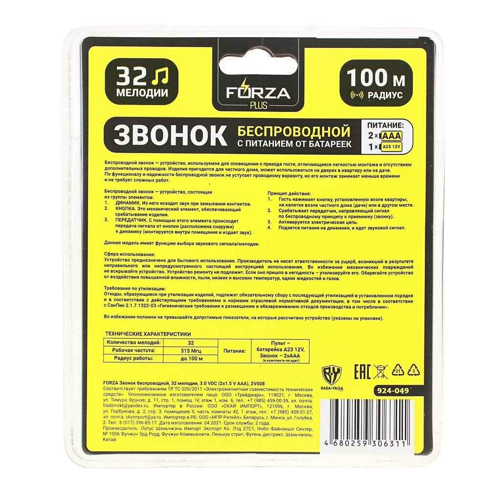 FORZA Звонок беспроводной, 32 мелодии, 3.0VDC(2x1.5VAАA), ZV008 информация: