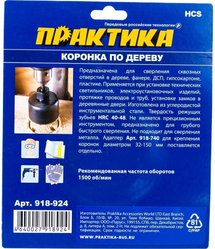 | Дополнительная информация | Коронка HCS по дереву ПРАКТИКА 68мм |