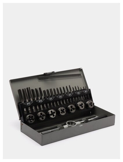 | Подробная комплектация | метчикодержатель: 1 шт; плашкодержатель: 1шт; резьбомер: 1 шт; отвертка: 1шт; плашки: M3х0.5, M4х0.7, M5х0.8, M6х1.0, M8х1.25, M10х1.5, M12х1.75; метчики: M3х0.5, M4х0.7, M5х0.8, M6х1.0, M8х1.25, M10х1.5, M12х1.75 |