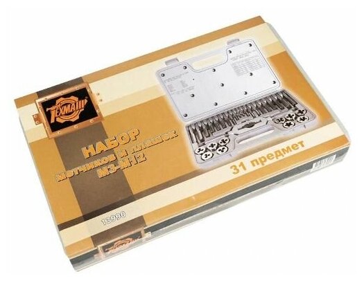 | Подробная комплектация | - метчики: М3х0,5, М4х0.7, М5х0.8, М6х1.0, М8х1.0, М8х1.25, М10х1.0, M10х1.5, М12х1.25, М12х1.75 (по 2 шт); - плашки: М3х0.5, М4х0.7, М5х0.8, М6х1.0, М8х1.0, М8х1.25, M10х1,0, М10х1.5, М12х1.25, М12х1.75; - вороток универсальный; - пластиковый кейс. |
