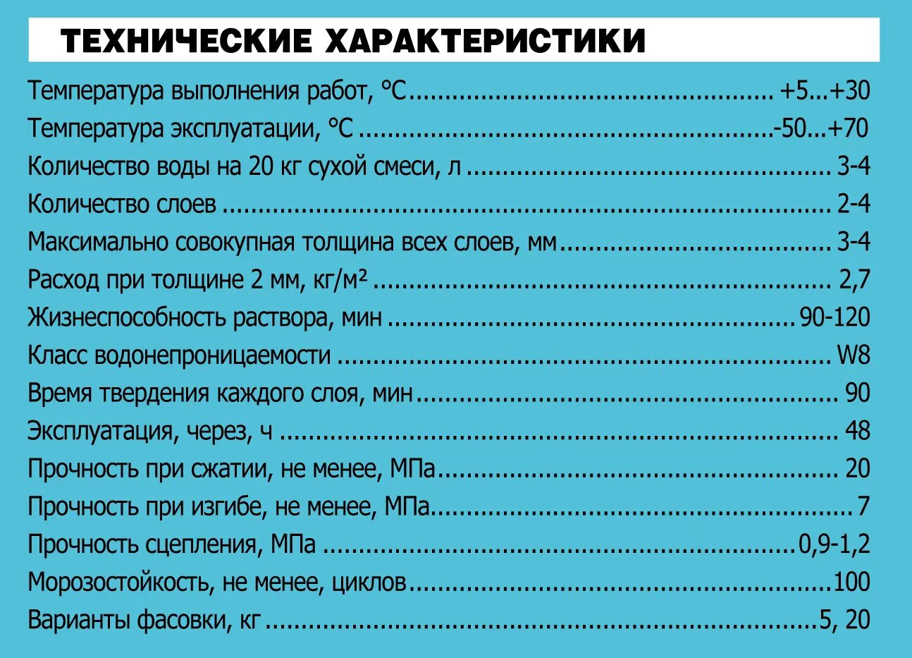| Дополнительная информация | дальнейшие работы проводить через 12 ч после нанесения; прочность сцепления: не менее 0,5 МПа; температура проведения работ: от +5 до +30 °С |