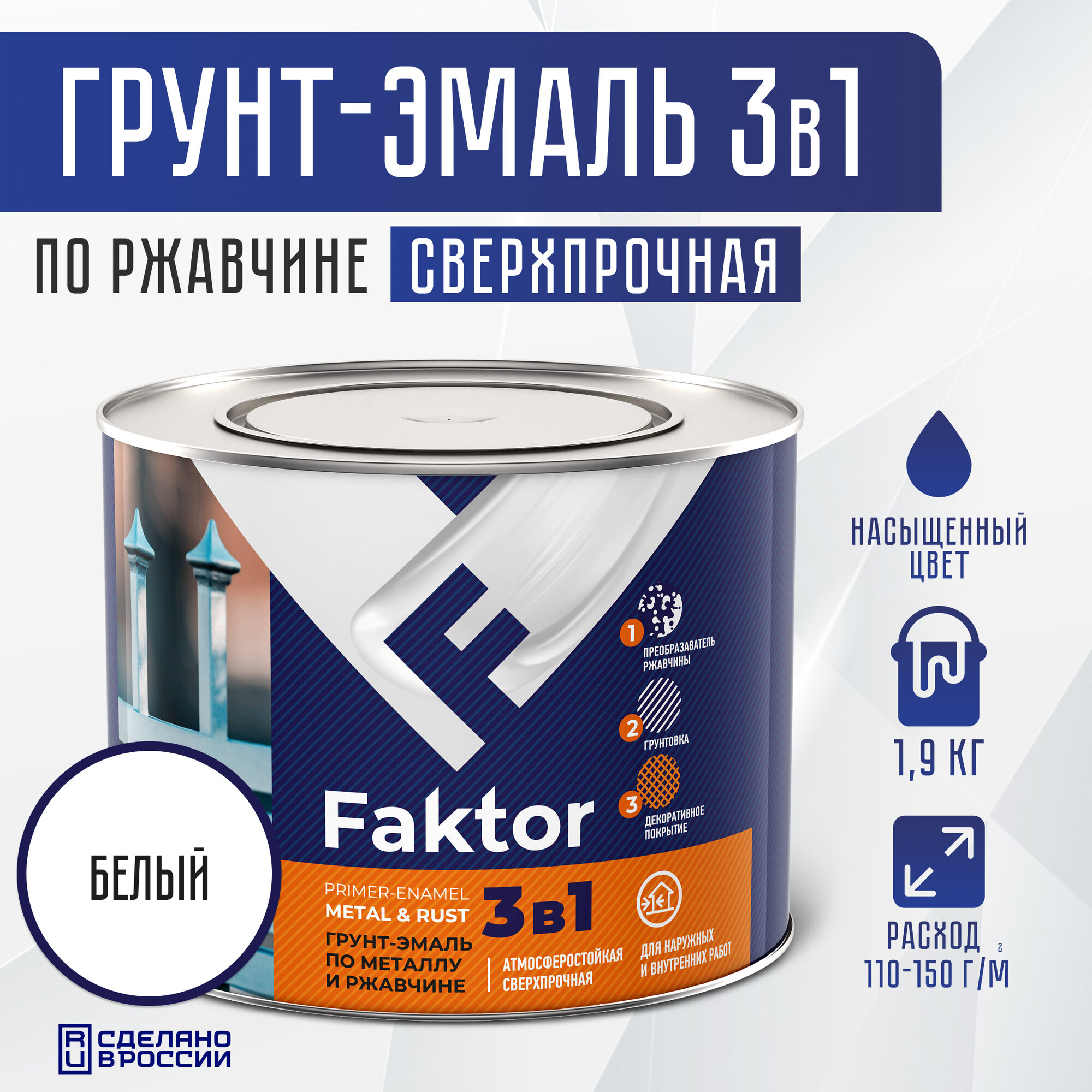 Грунт-эмаль 3 в 1 по ржавчине, сверхпрочная, белый, 1.9 кг информация: