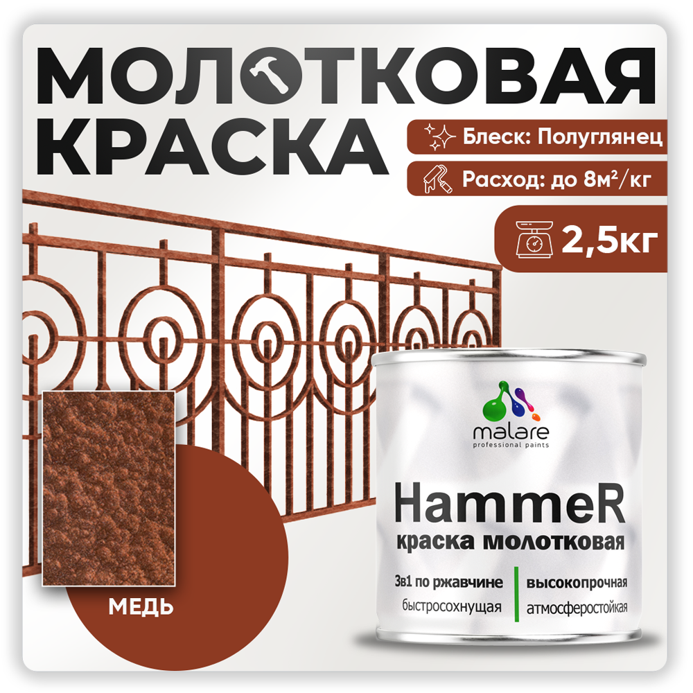 10 цен на Грунт-Эмаль 3 в 1 Hammer для металлических поверхностей, молотковая краска, быстросохнущая, антикоррозионная, полуглянцевая, медь, 2,5 кг.