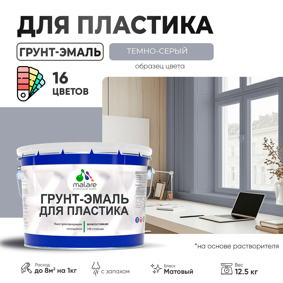 Грунт-Эмаль, Краска Malare 3 в 1 для пластика, окон и подоконников, сайдинга, быстросохнущая, матовый, темно-серый, 12,5 кг. информация:
