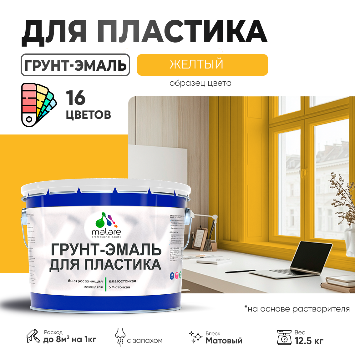 Грунт-Эмаль, Краска Malare 3 в 1 для пластика, окон и подоконников, сайдинга, быстросохнущая, матовый, желтый, 12,5 кг. информация:
