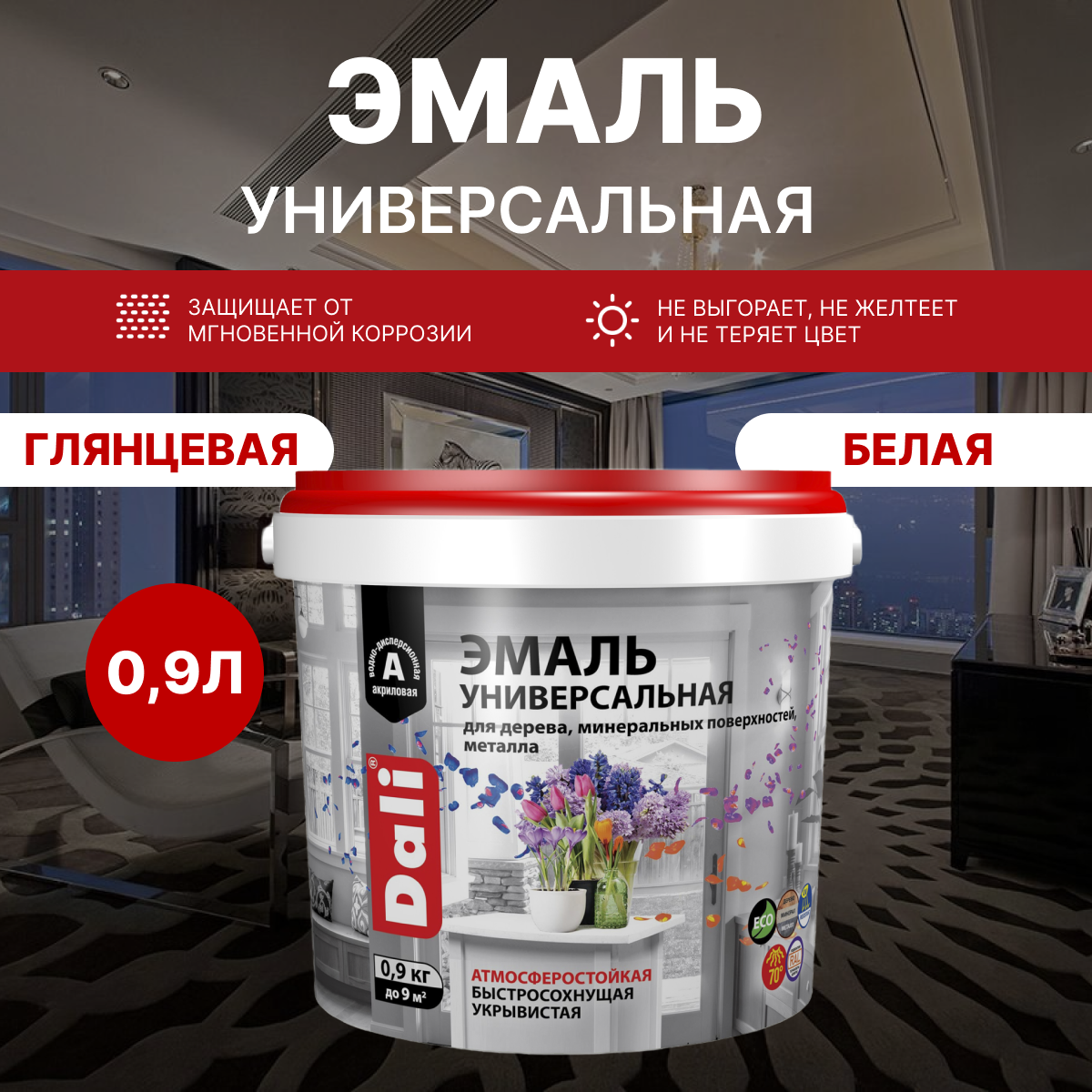 DALI / дали эмаль универсальная акриловая атмосферостойкая глянцевая база А белый RAL 9010 0,9 кг информация: