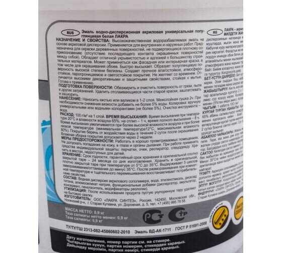 Эмаль акриловая лакра 0,9кг белая полуглянцевая