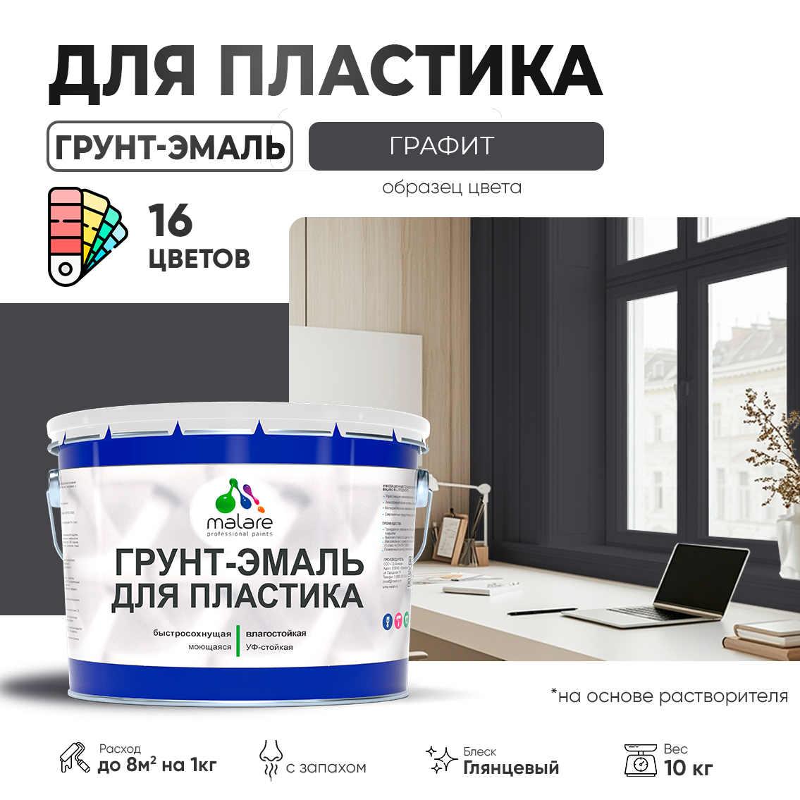 Грунт-Эмаль, Краска Malare 3 в 1 для пластика, окон и подоконников, сайдинга, быстросохнущая, глянцевый, графитово-серый (тёмный), 10 кг. информация: