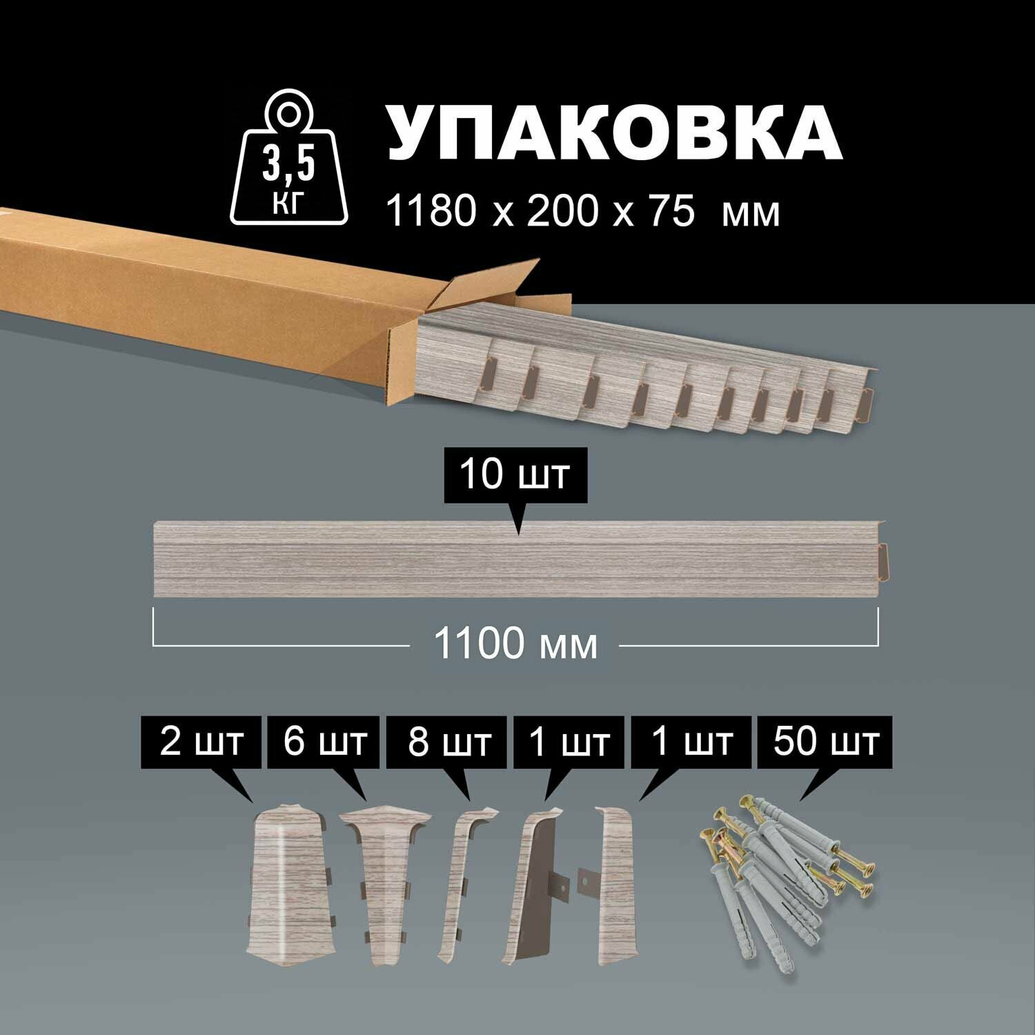 Плинтус напольный 1100 х 72,5 мм , 10шт , с кабель-каналом , цвет Ясень Серый 2 400 ₽