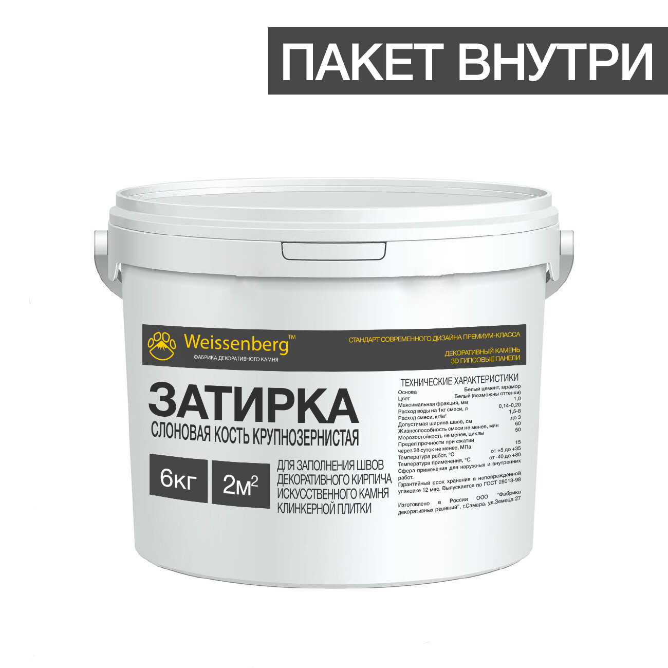 | Дополнительная информация | Комплектация: пакет/рукав для нанесения внутри ведра, в цветных затирках колер внутри ведра (номер 01, 03-11, 13-16) |