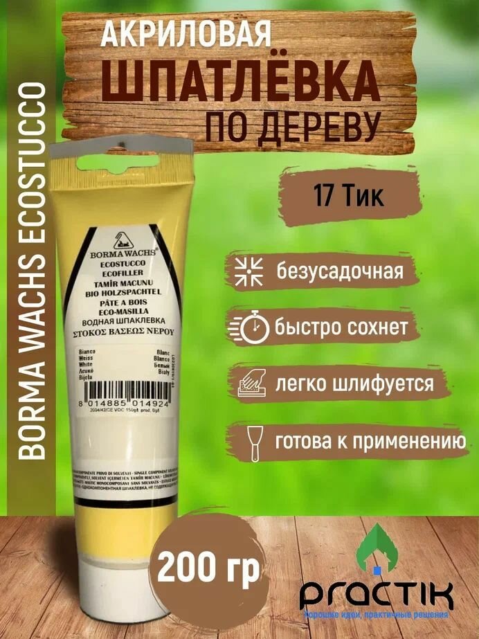 10 цен на Шпаклёвка по дереву акриловая на водной основе безусадочная, в тубе, Borma Wachs Ecostucco 200гр., Тик 17, Быстро сохнет, легко шлифуется.