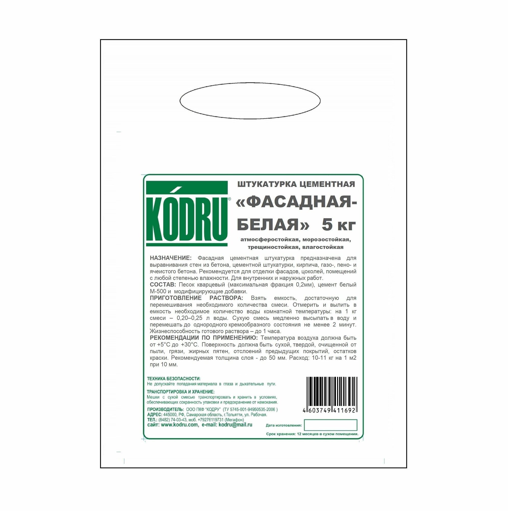 Штукатурка цементная "фасадная-белая" (5 кг), KODRU, вн/наруж. работы, атмосферостойкая, морозостойкая, трещиностойкая, влагостойкая информация: