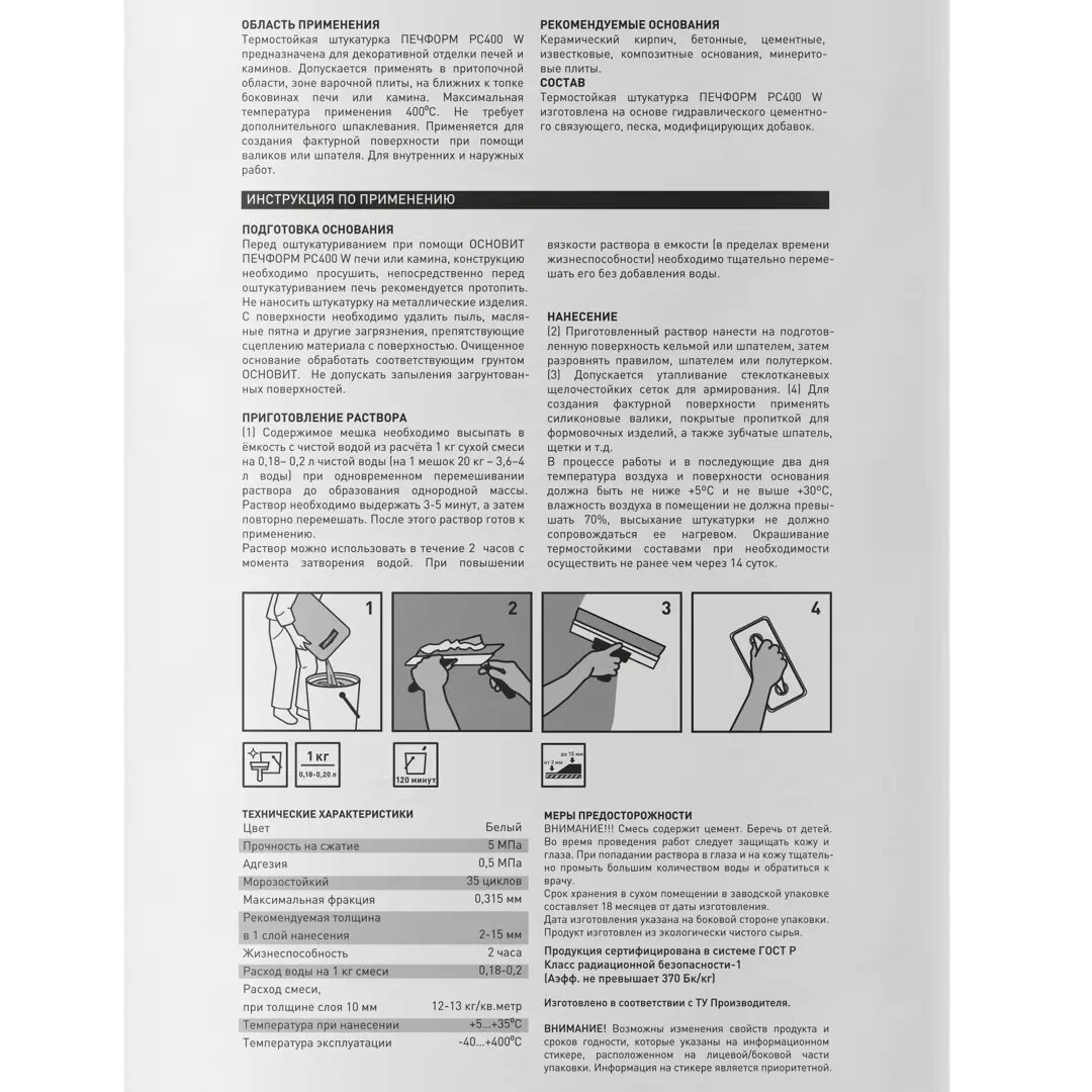 Термостойкая штукатурка основит печформ PC400 W, белая, 20 кг