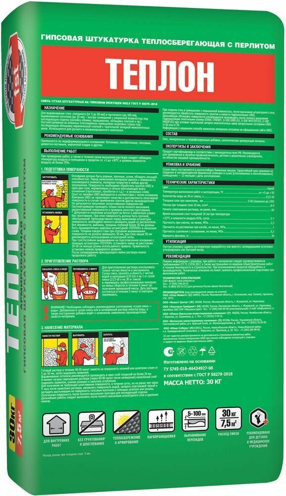 Юнис Теплон штукатурка гипсовая армированная (30кг) / UNIS Теплон армированная гипсовая штукатурка с перлитом (30кг) информация: