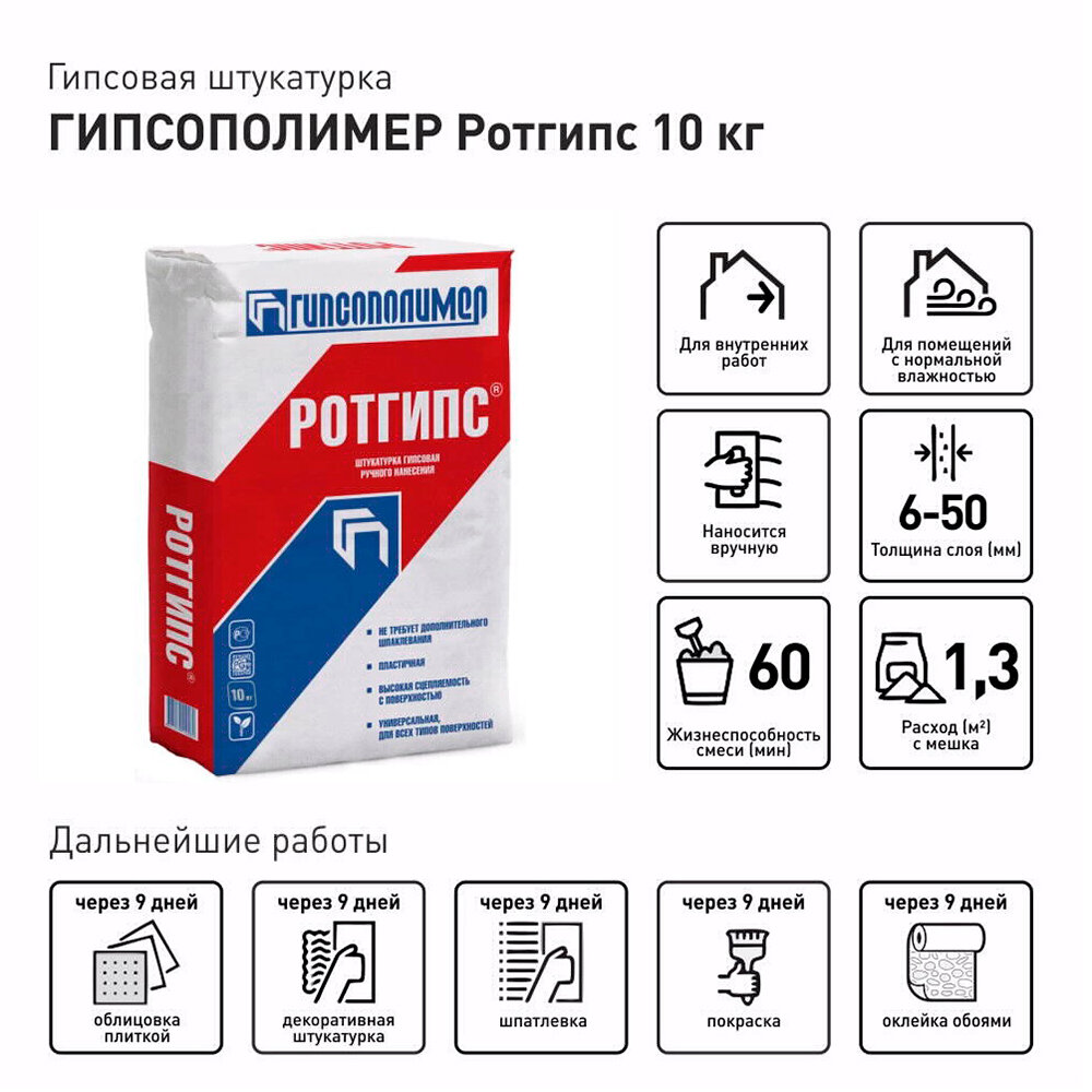 Штукатурка гипсовая ротгипс гипсополимер для высококачественного выравнивания ручным способом стен и потолков 10 кг информация: