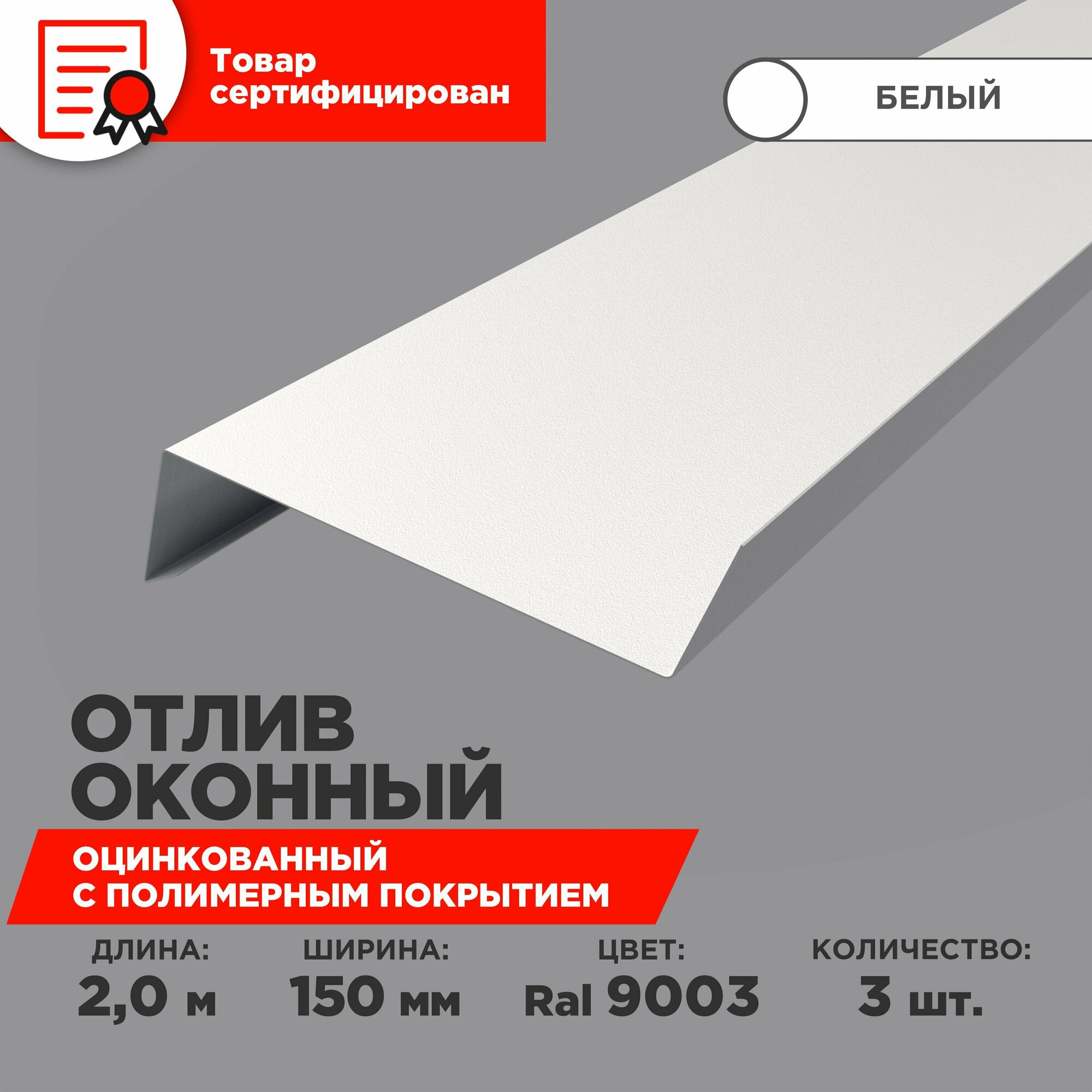 Отлив оконный ширина полки 150мм/ отлив для окна / цвет белый(RAL 9003) Длина 2м, 3 штуки в комплекте информация: