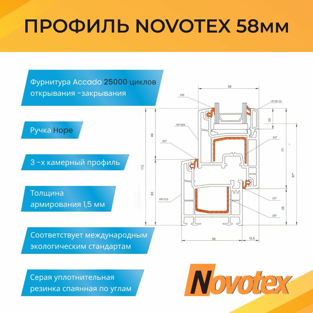 Окно 1350х600 мм Двухстворчатое тип1 (одна створка поворотно откидная правая) Novotex Techno 58 1 камера