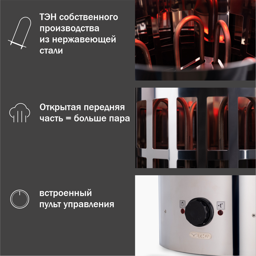 Электрокаменка УМТ Сфера ЭКМ 9 кВт (380/220 В, встроенный пульт, нержавеющая сталь) информация: