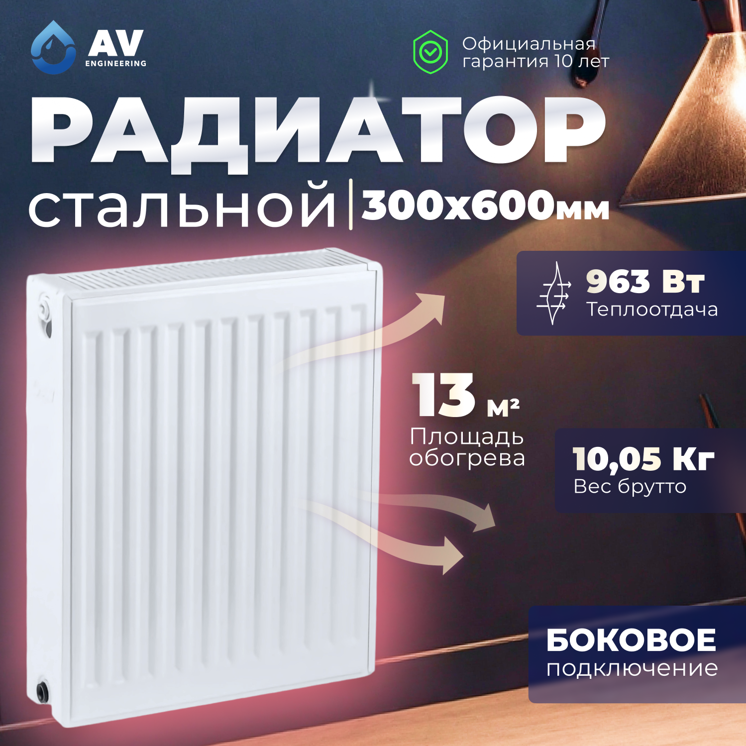 Радиатор стальной панельный Expert EB 22-3-10 1,2 мм, AV Engineering (1605 Вт, 16,25 кг) (AVE-22310B) 9 600 ₽