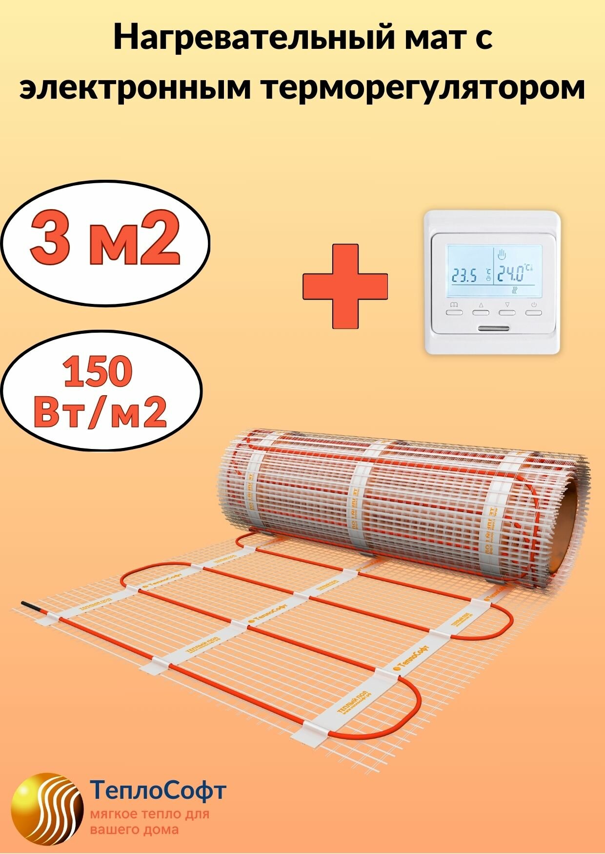 Теплый пол электрический Теплософт под плитку 3 м2 с электронным терморегулятором. Нагревательный мат 3м.кв. информация:
