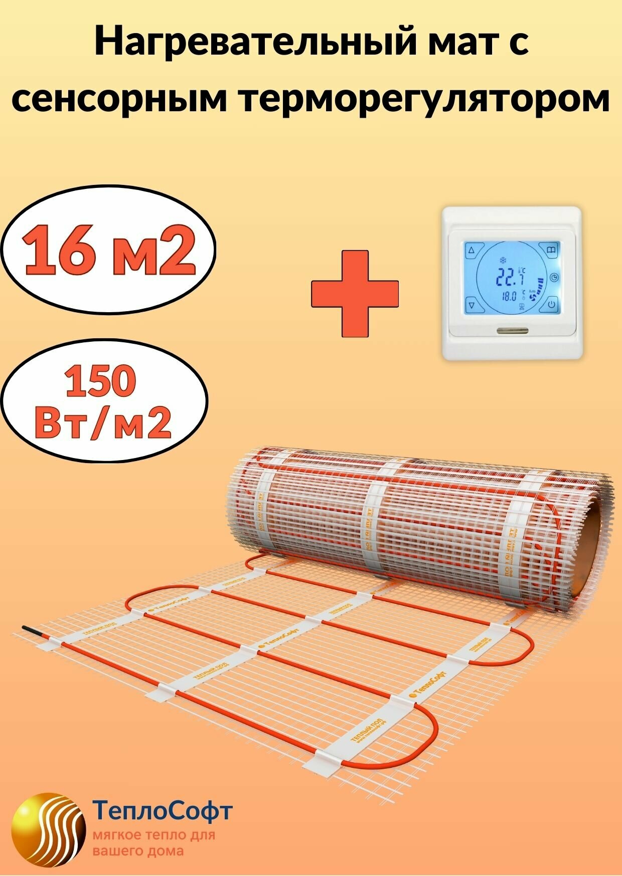 Теплый пол электрический Теплософт под плитку 16 м2 с сенсорным терморегулятором. Нагревательный мат 16м.кв. информация: