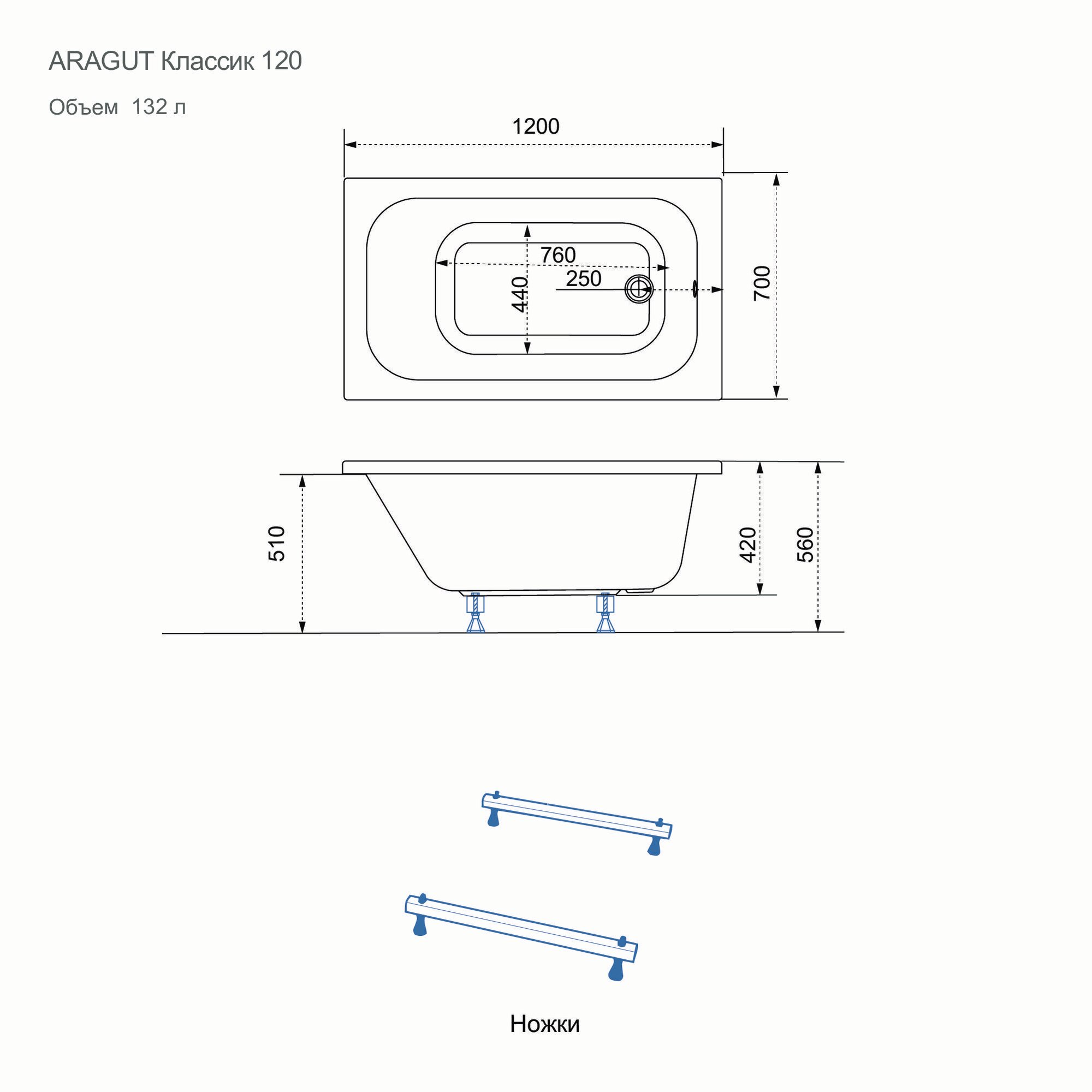 Акриловая ванна ARAGUT Классик 120х70 в комплекте с ножками информация:
