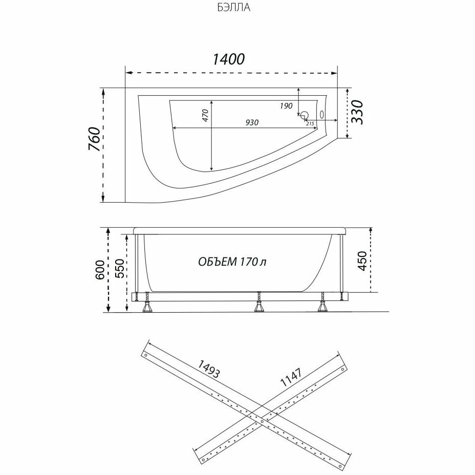 Ванна обрезная асимметричная Тритон акриловая Бэлла Экстра 1400х760х600 мм правая (Н0000020162), (без монтажного комплекта/ножек) информация: