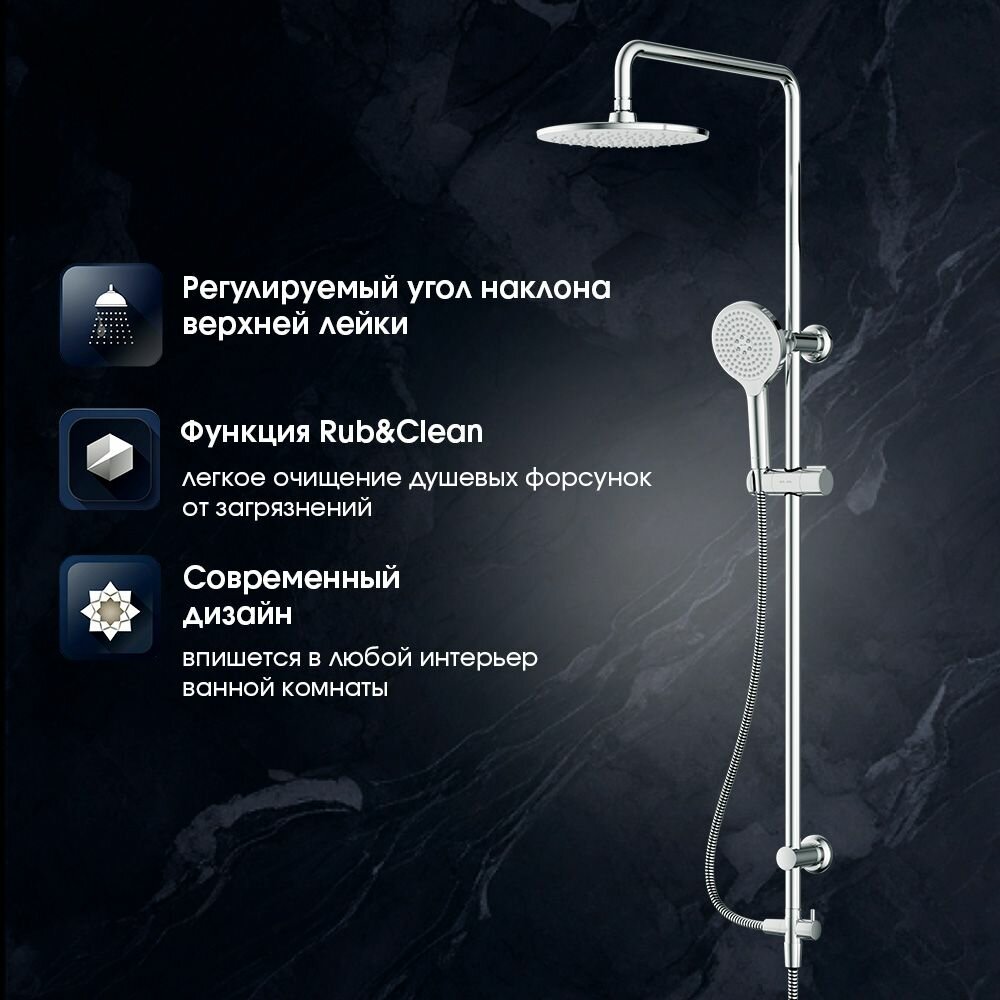 | Дополнительная информация | в комплекте: верхний душ, ручной душ, держатель ручного душа, штанга, шланг, установочный крепеж, инструкция |