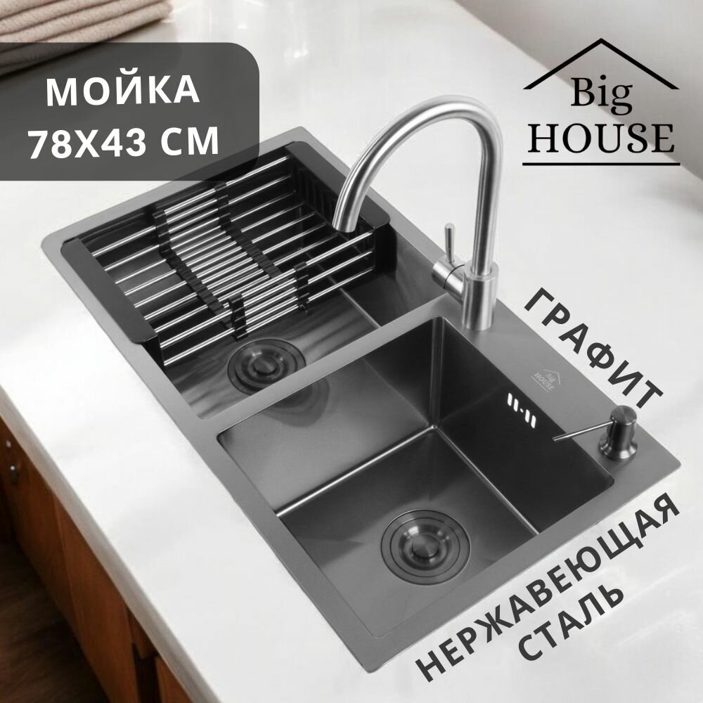 Мойка врезная Big House Двойная 78х43 см, толщина 3,0х0,8 мм, глубина 215 мм, цвет Графит, сифон с переливом + коландер + дозатор информация: