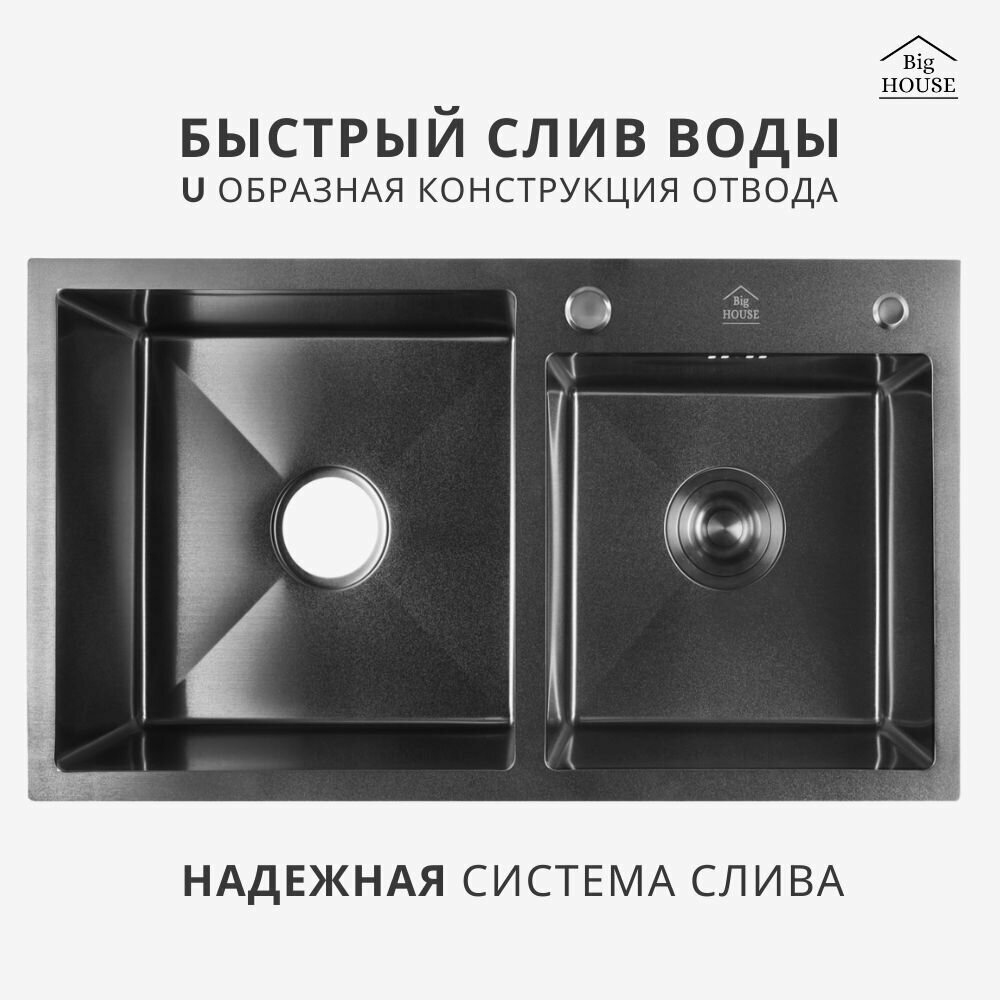 Отзывы на Мойка врезная Big House Двойная 78х43 см, толщина 3,0х0,8 мм, глубина 215 мм, цвет Графит, сифон с переливом + коландер + дозатор