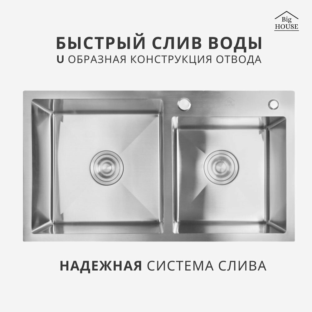 Мойка врезная Big House Двойная 78х43 см, толщина 3,0х0,8 мм, глубина 215 мм, сифон + коландер информация: