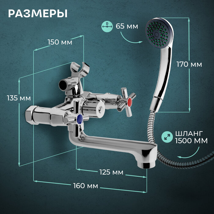 Смеситель для ванны ZEIN econom, кран-букса 1/2", излив 30 см, с душевым набором, хром