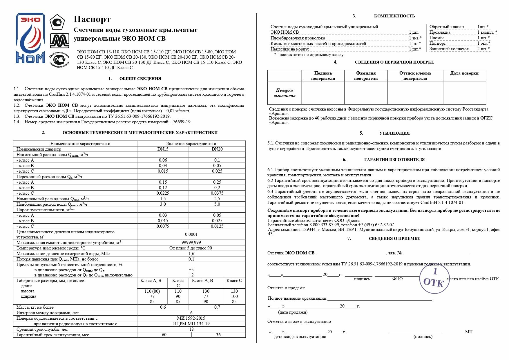 Счетчик воды универсальный ЭКО НОМ СВ -15-110 без КМЧ информация: