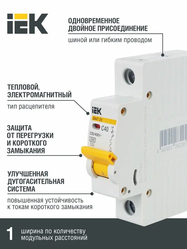 Автоматический выключатель ВА47-29 1Р 40А 4.5кА С IEK 2шт информация:
